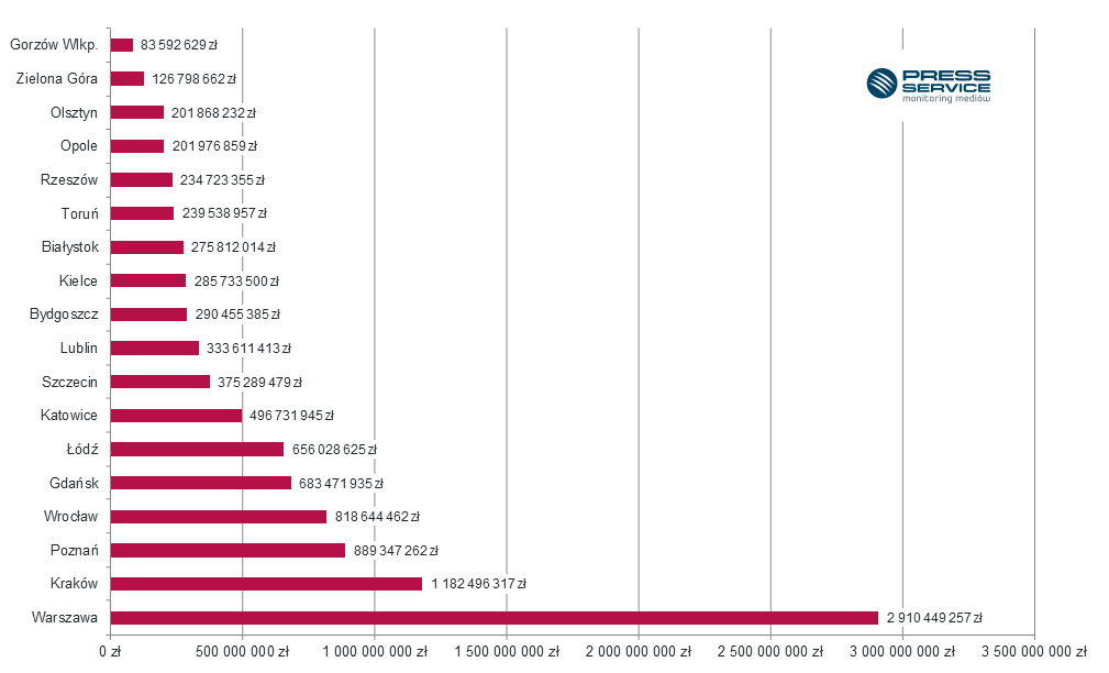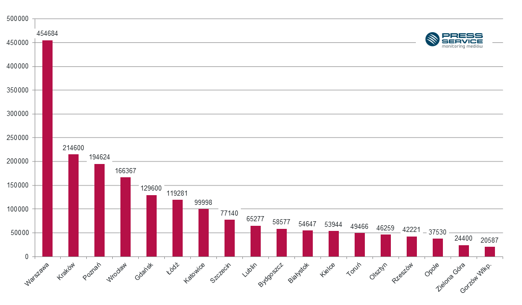Stolica województwa mazowieckiego została liderem zestawienia pod względem wskaźnika dotarcia. Potencjalna liczba kontaktów odbiorców z materiałami na temat stolicy mogła wynieść aż 273 miliardy. Warszawa dominowała także w publikacjach na pierwszych stronach gazet.