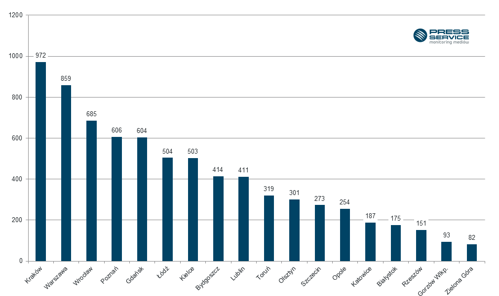 W tytułach publikacji prasowych i internetowych dziennikarze najczęściej wymieniali Kraków (972 materiały), a następnie Warszawę (859) i Poznań (685). Na kolejnych miejscach znalazły się miasta: Poznań, Gdańsk, Łódź i Kielce.
